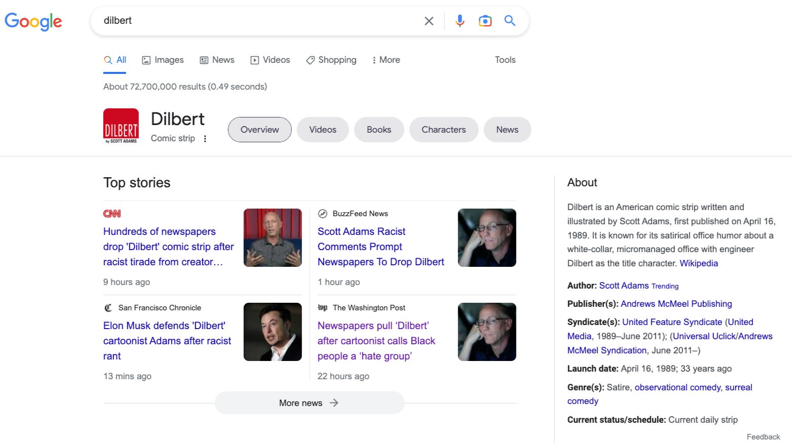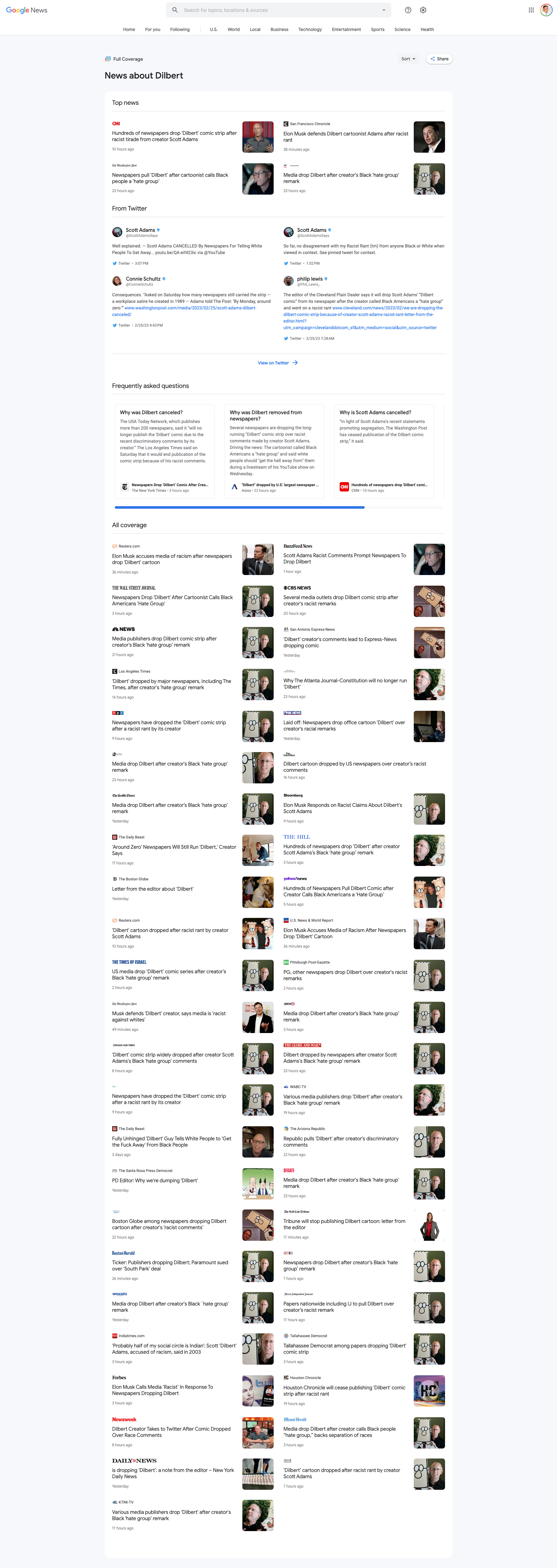 Finally, the volume of news coverage from a wide variety of media outlets, almost all of which include some variation of the words “dilbert” and/or “scott adams” and “racist” in their headlines is a powerful signal for algorithms to interpret.