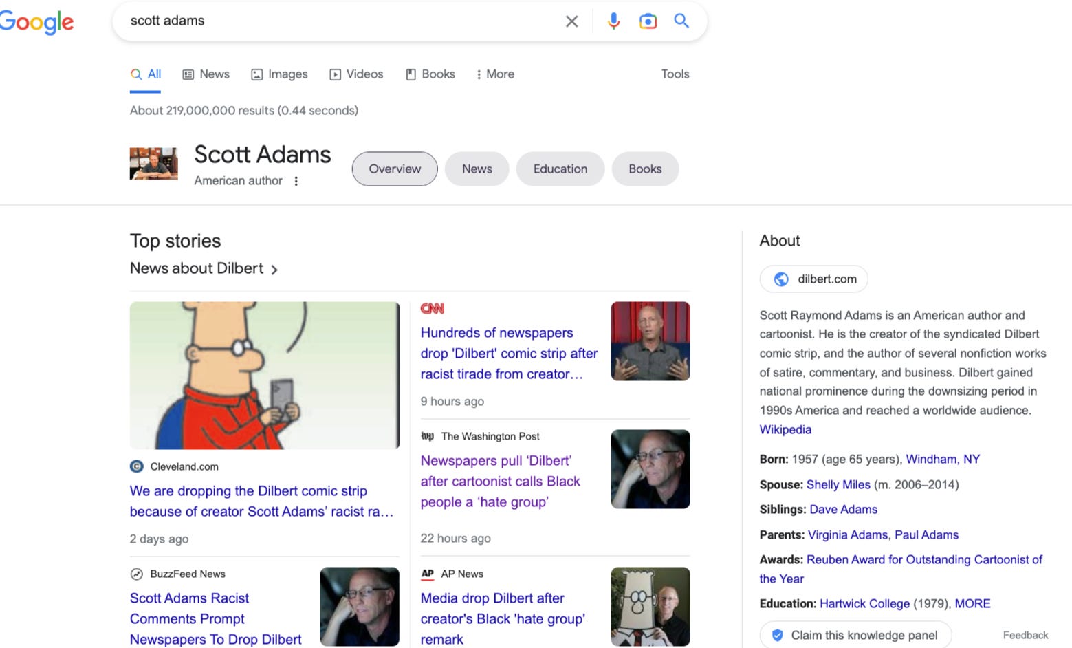 Assuming Scott Adams never has a full-on mea culpa and unambiguous retraction of his history of racist remarks (highly unlikely), the algorithms will have had their say on Adams’ reputation. Now, when you seek information about him, his history of racism will always accompany that information.