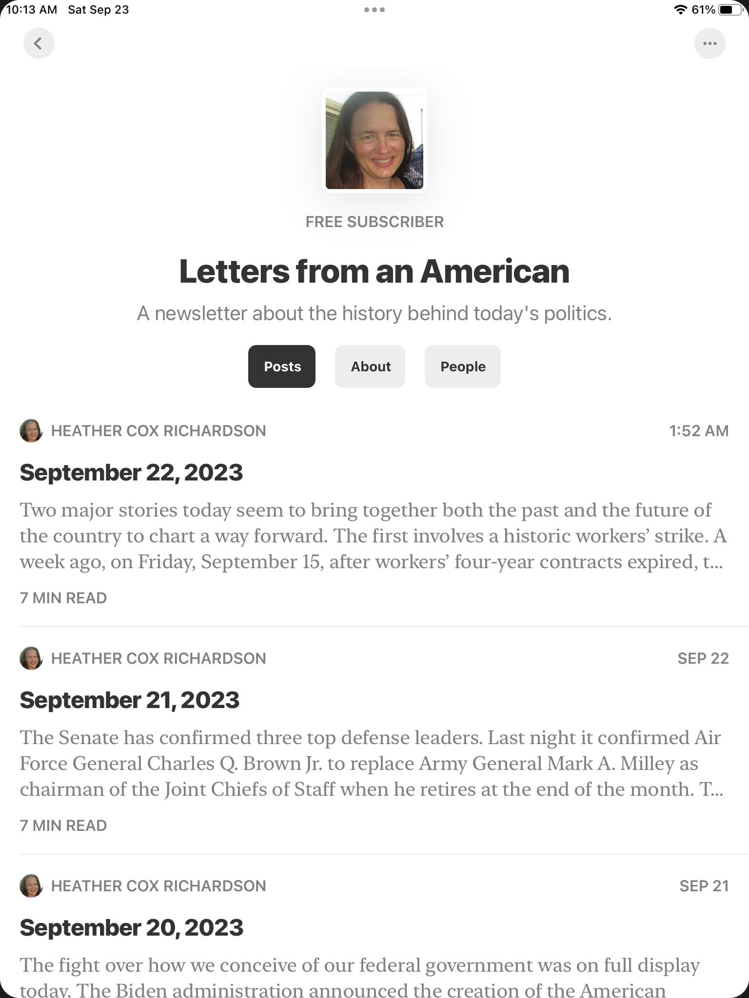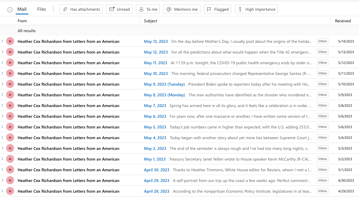 Finally, using a date as the title for each newsletter edition is consistent with the name of her newsletter: Letters from an American. Letters arrive in your mailbox with a dated postmark!