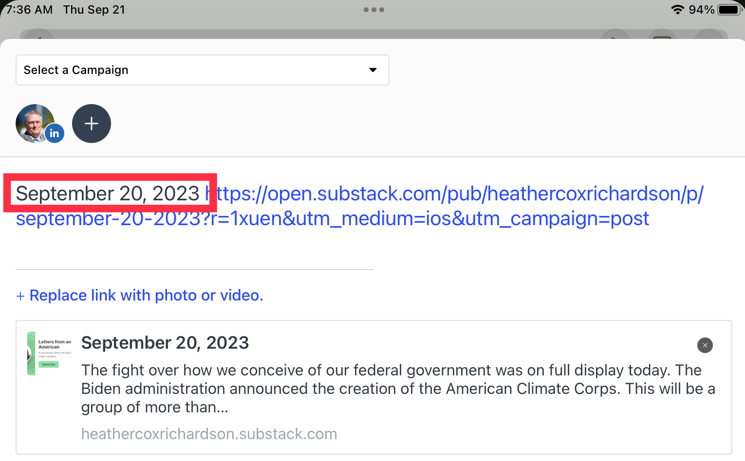 Another downside to naming your newsletter editions in this way is that it provides no hint of the content when someone wants to share it on social media. This is what it looked like when I went to share an article to LinkedIn via Buffer: