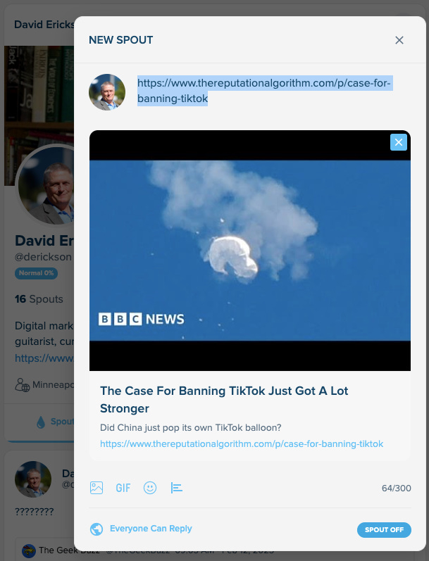 Obviously, paying for technical infrastructure and growth will be a challenge. Right now, you cannot advertise on Spoutible and the user data the platform is generating will not be enough to entise the social listening platforms to pay for access to a data firehose. Right now, Bouzy is relying on donations and apparently his own funding.