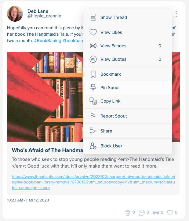 Did you notice the little trashcan icon in the screenshot of the spout earlier? That shows the number of replies to a spout that have been deleted.